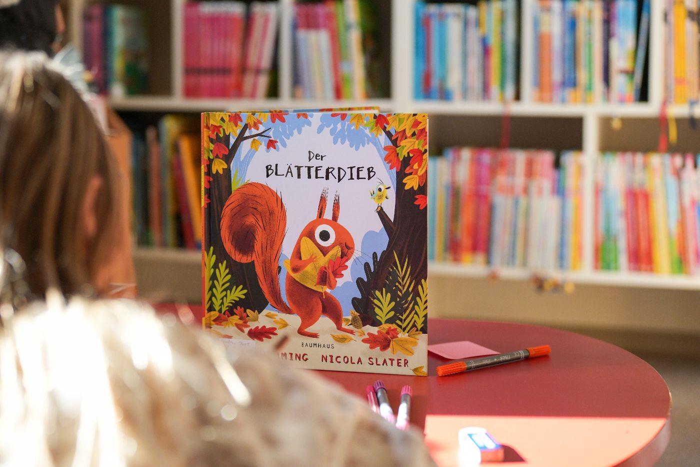 Den Kindern wurde das Buch „Der Blätterdieb“ von Alice Hemming auf interaktive Weise vorgestellt. In der Bilderbuchgeschichte ist ein Eichhörnchen außer sich, da jemand ein Blatt gestohlen hat. Gemeinsam mit Frau Assel und Herrn Specht versucht das Eichhörnchen das Rätsel zu lösen.